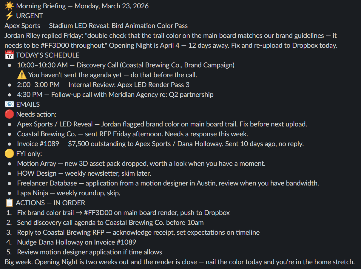 Email, Slack, calendar, Notion. What needs a response, what has a deadline today, what I've been sitting on too long, what's moving and what's stalled. The whole picture in about five minutes.